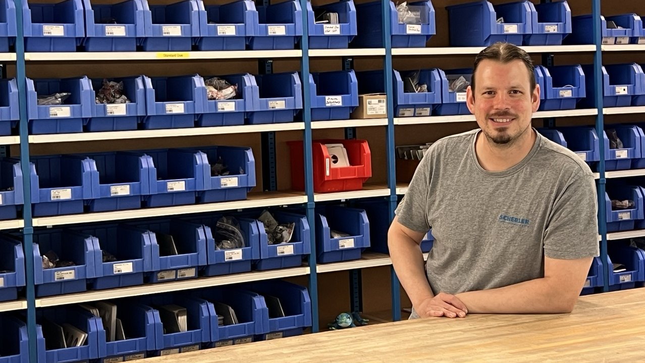Egger ist seit 30 Jahren ein ergebener Scherler-Mitstreiter, ist nach seiner Lehrzeit im Stammesheer geblieben und hat sich mit seiner gewissenhaften, umgänglichen, hilfsbereiten und ruhenden Art zum Chef-Magaziner weiterentwickelt. Wie ein Feldweibel macht er den Traum eines jeden ordentlichen Lagers wahr: «Mit Ruhe und Ordnung und manchmal sogar ‘Pingeligkeit’ sorge ich für den Warendurchfluss, wo viel Geld drinsteckt. Ich bin mir den Wert sehr wohl bewusst, der im Magazin gelagert wird und pflege das Herzstück – denn ohne Material und Werkzeug kann hier niemand seine Arbeit verrichten.»