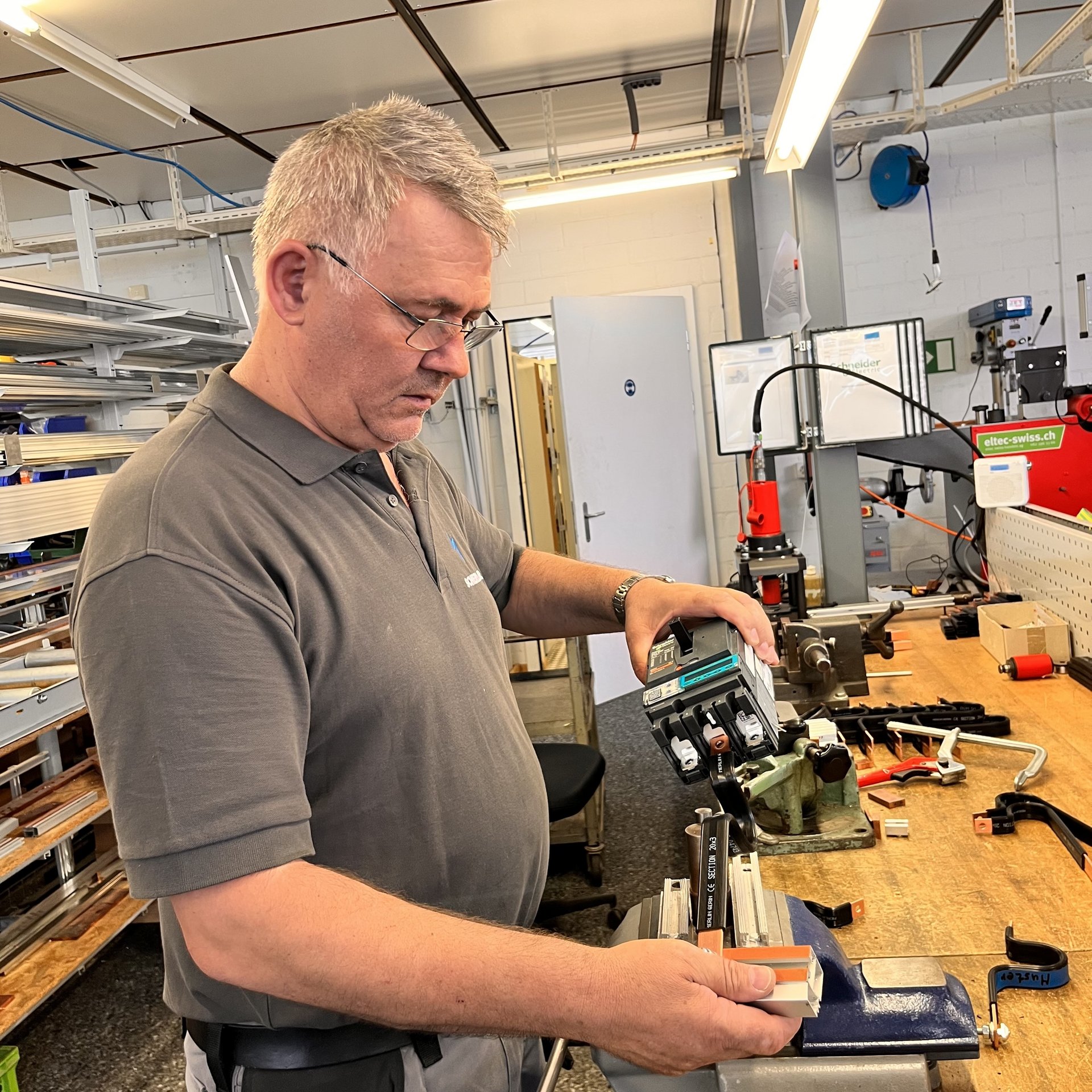 Ismajl Pulaj biegt flexiblen Kupfer für spezielle Schneider-Anschlüsse. Das Handwerk vollbringt er in Massanfertigung. Zuerst schneidet er Kupfer, biegt es auf einer speziellen Maschine in die korrekte Form, die sein Sohn für ihn gemacht hat. Seit fünf Jahren arbeitet Ismajl in unserer Werkstatt im Schaltanlagenbau.