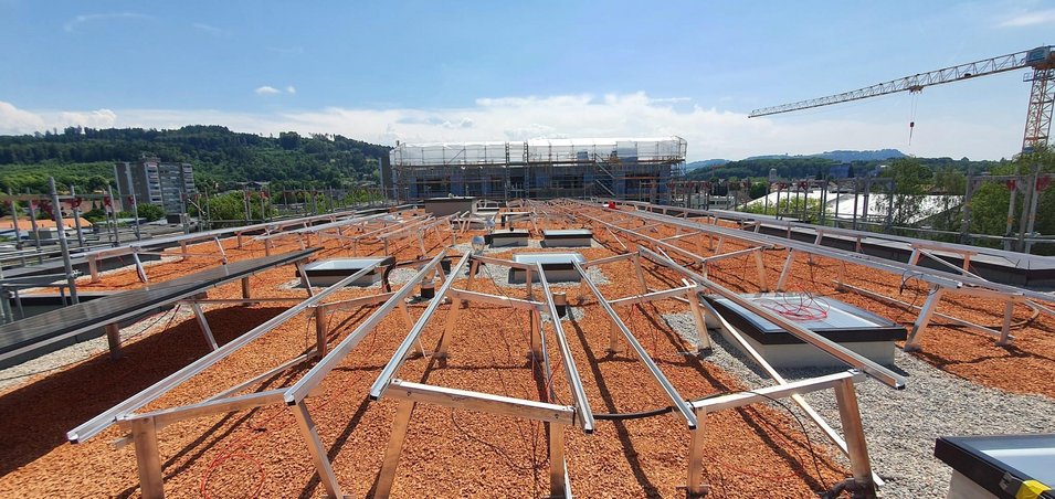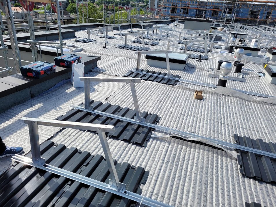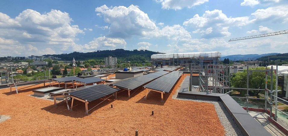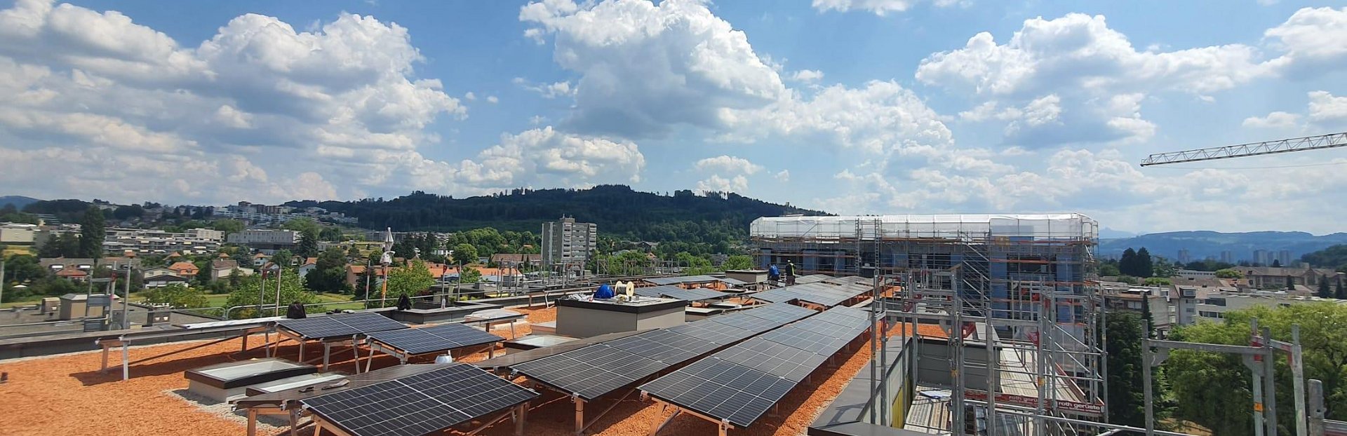 Aktuell realisieren wir eine PV-Anlage auf einem Mehrfamilienhaus mit 24 Wohnungen an der Unterdorfstrasse 27 und 29 in Ostermundigen: Auf einem Gründachsystem mit Substratboden montierten wir 96 Solarpanels zu je 1.95 m2 Grösse mit einer maximalen Leistung von 40 Kilowatt-Peak, die rund 24 Wohnungen mit Strom versorgt.