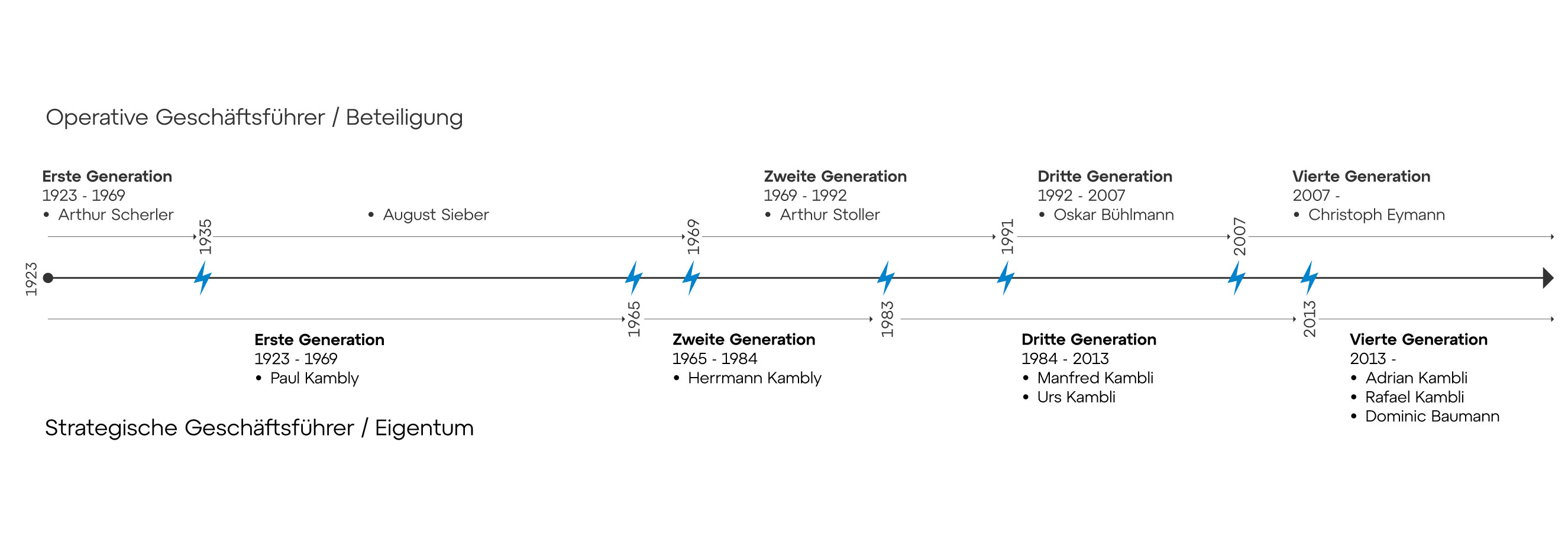 Das macht uns seit Jahren aus: unsere Geschichte. Die Unternehmen Scherler und Kambli sind geprägt von einer klaren, generationenübergreifenden Weitergabe der Verantwortung – sowohl in der operativen Geschäftsführung als auch im strategischen Eigentum. Seit 1923 haben vier Generationen das Unternehmen geleitet und weiterentwickelt. Heute stehen Christoph Eymann (operative Leitung) sowie Adrian Kambli, Rafael Kambli und Dominic Baumann (strategisches Eigentum) für eine moderne, wertebasierte Führung mit starkem familiärem Fundament.
